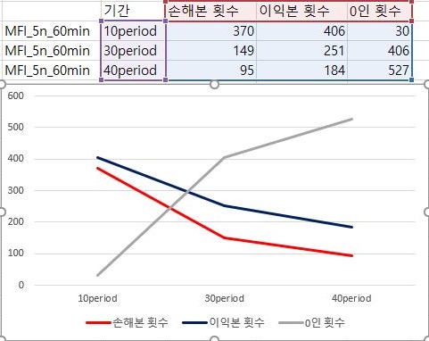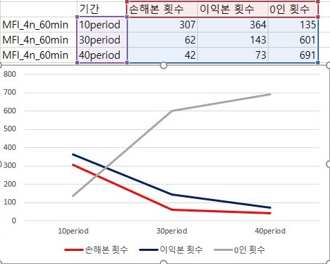 다음으로 해야 하는 일은 일단 이익을 본 종목의 갯수와 손해를 본 종목의 갯수등을 한번 비교해 보도록 합니다. 여기서 나오는 종목의 갯수를 보면, 우선 언제나 이익을 보는 종목의 갯수가 더 많지만, period가 늘어나면 늘어날 수록 거래가 없는 종목의 갯수도 더 많이 늘어납니다.
