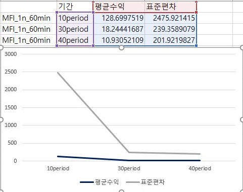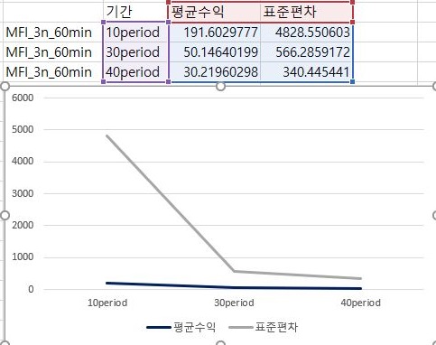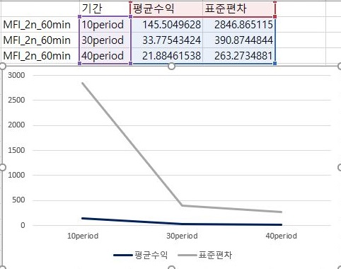 먼저 60분봉 캔들챠트에서 얻은 자료를 가지고서 한번 알아보기 위해서 이번에는 위 스크린샷처럼 평균수익을 보도록 했는데, 여기서는 특이하게도 어찌된 셈인지 period가 길어지면 길어질 수록 평균 수익이 떨어지는 기현상을 보이고 있습니다.