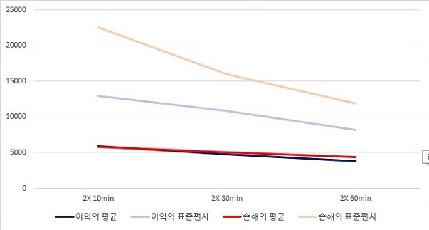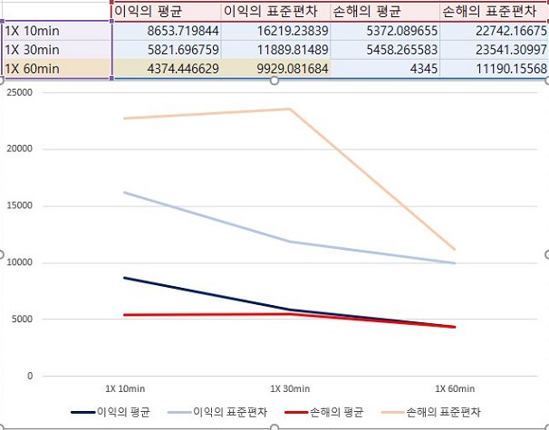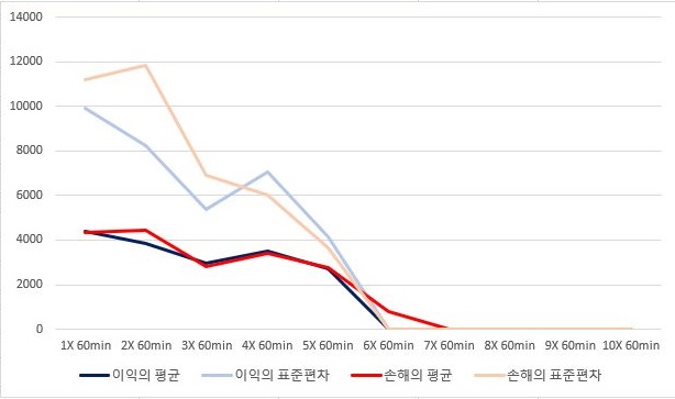 그리고 나서 다음으로는 60분봉 캔들챠트 데이터 베이스에서 얻은 결과를 봐야 하는데, 여기서는 처음에는 거의 손해와 이익의 평균이 같다가 이후 손해의 평균이 더 커졌고, 이후에는 같이 가는 기현상을 보이고 있는 것을 확인할 수 있었습니다.