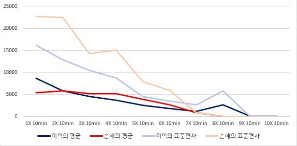 일단 먼저 10분봉 캔들챠트 데이터 베이스에서 얻은 결과를 가지고서 한번 작업을 해 보도록 해야 겠습니다. 일단 여기서는 표준편차에 2배를 해주는 시점에서 부터 손해의 평균량이 이익의 평균을 넘어가는 기현상을 확인할 수 있었습니다.