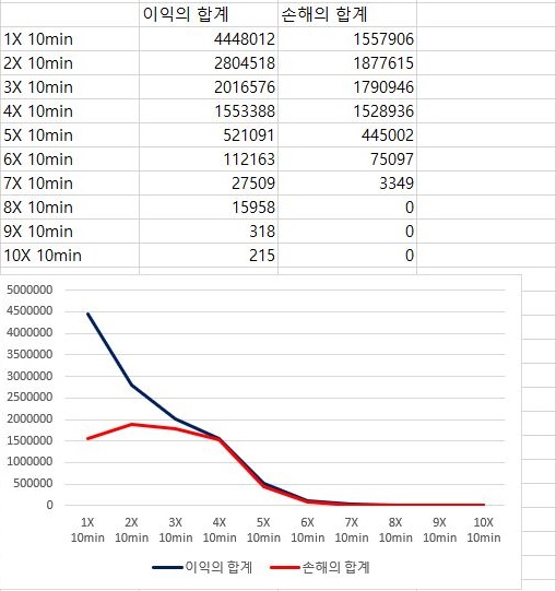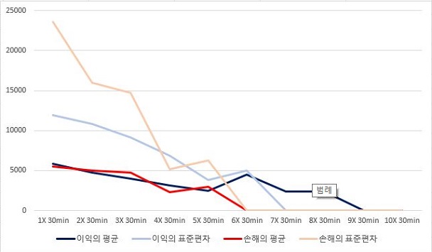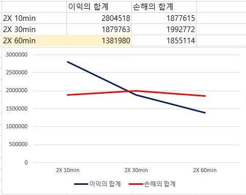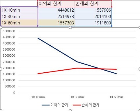 여기서도 손해의 합계는 거의 변하지 않는 경향이 있는데, 이익의 합계는 캔들챠트의 분봉이 커지면 커질수록 더 떨어지는 경향을 보이고 있습니다.