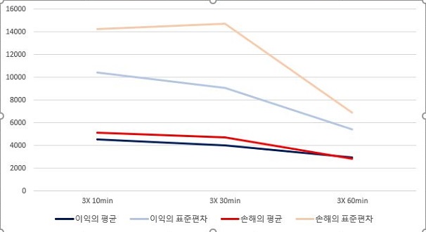 그리고 나서 이익과 손해의 합계에 대해서 그래프를 그려 보았더니, 여기서는 일단 너무 손해의 합계가 크다는 것을 확인할 수 있었고, 표준편차에 3배를 해주는 조건 이후에야 겨우 이익의 합계가 손해의 합계를 넘어간다는 것을 확인할 수 있었습니다.