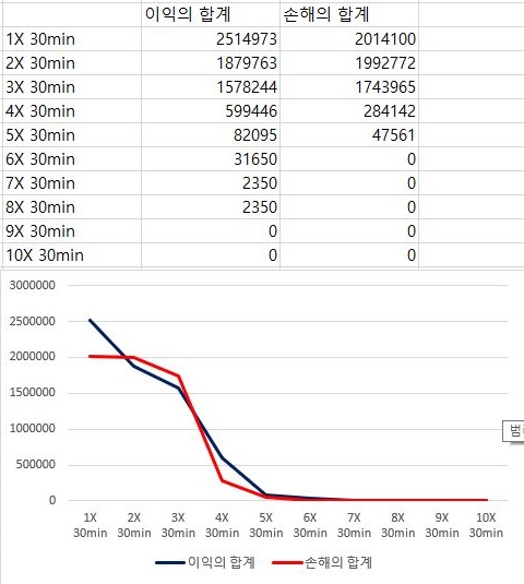 다음으로는 30분봉 캔들챠트 데이터 베이스를 가지고서 계산한 결과에 대해서도 한번 보아야 합니다. 일단 여기서는 우선 거의 이익과 손해의 평균이 똑같다가 이후 이래저래 변하는 것을 볼 수 있습니다.