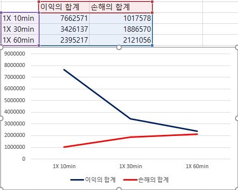 그리고 이익과 손해의 합계를 한번 구해보니, 위 스클니샷과 같이 일단 이익의 총합은 어째서 인지 이익은 캔들챠트의 분봉간격이 커질수록 급격히 감소하는데, 손해의 총합은 거치는 경향을 보이고 있습니다.