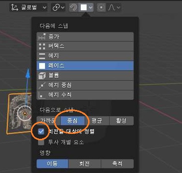 그리고 거기에 있는 옵션 중에서 중심이라는 옵션을 선택해 주고 나서, 다음으로는 회전을 대상에 정렬이라는 항목에 체크 표시를 해 주도록 합니다.