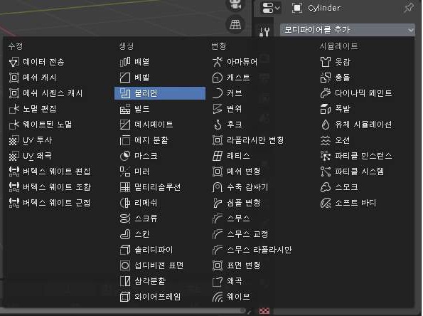 이제 프로퍼티 윈도우로 가서, 위 스크릔샷처럼 렌치 모양의 아이콘을 클릭해서 모디파이어를 추가하도록 합니다. 여기서 선택할 것은 아래 스크린샷에서 나오는 불리언입니다.