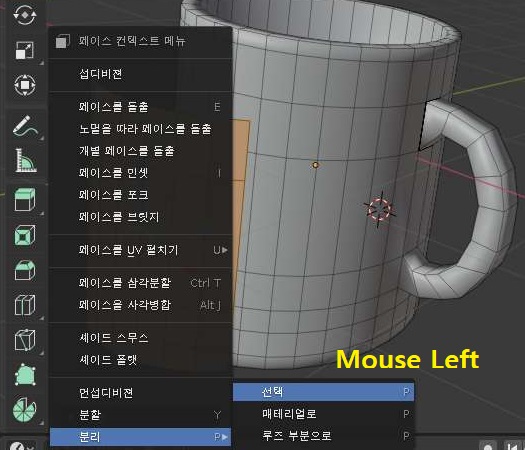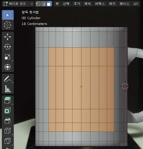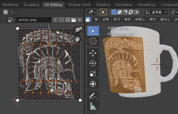 먼저 지난번 포스팅에서 볼 수있는 조형이 완료가 되었는 머그컵에서 벡터 그래픽을 넣고자 하는 면에다가 위 스크린샷처럼 한번 페이스를 선택할 수 있도록 하는 에디트 모드에서 페이스를 선택해 보도록 합니다.