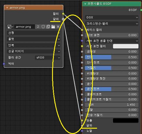 다시 한번 세이딩 윈도우로 가서, 이미지 텍스쳐 노드에 있는 알파라는 항목을 피린시폴드 BSDF에 있는 알파 항목에다가 연결을 먼저 하도록 합니다.