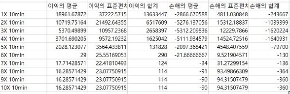 다음으로 할 수 있는 것으로는 이제까지 10분봉 캔들챠트 데이터 베이스를 사용해서 나온 것인데, 여기서 부터는 30분봉 캔들챠트 데이터 베이스를 사용해서 나오는 결과를 가지고서 한번 작업에 들어갔습니다. 일단 여기서도 이익의 평균이 손해보다 높기는 하지만, 이후에 3배수를 해주는 시점에서 역전이 되는 것을 확인할 수 있습니다.