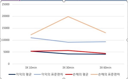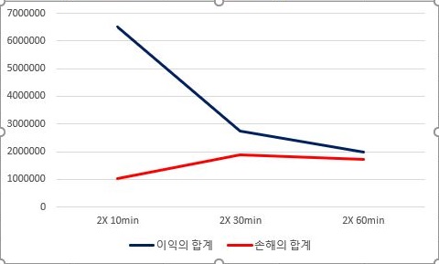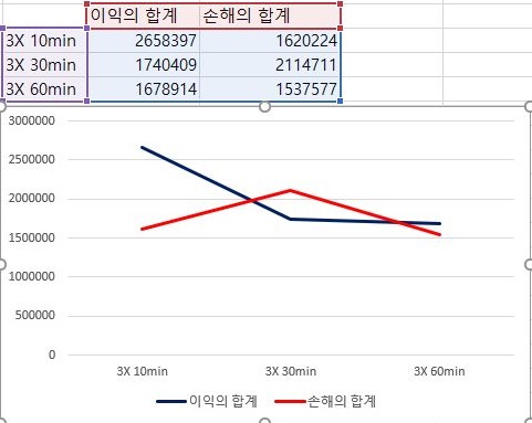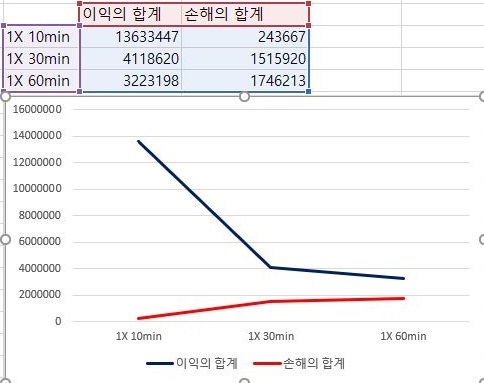 다음으로는 이익과 손해의 합계에 대해서 한번 알아보고자 했습니다. 그런데 여기서 하나 알 수 있는 것은 처음에는 이익이 손해보다 더 많이 보고 있다가 나중에는 그 관계가 거의 역전이 되는 것을 볼 수 있습니다. 일단 이렇게 해서 캔들챠트 분봉 간격에 따른 차이를 보면, 우선 10분봉을 이용하는 것이 가장 좋다는 것을 30 period에서 알 수 있었습니다.