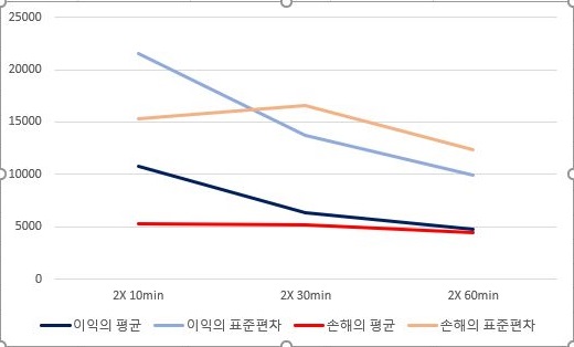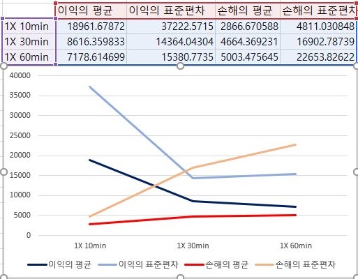 다음으로는 표준편차에 2배수를 해주는 조건에 들어와서 어떻게 해서 답이 나오는지 여부를 알아보고자 합니다. 일단 여기서도 역시 캔들챠트의 분봉이 커지면 커질수록 이익의 평균은 떨어지고 있습니다. 다만 손해의 평균은 이 상황에서는 그렇게 변하지 않는 것을 볼 수 있습니다.