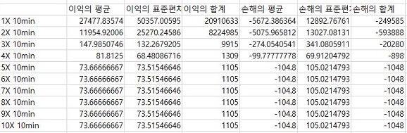 이렇게 해서 일단 10분봉 캔들챠트 데이터 베이스를 사용해서 나온 결과에 대해서 한번 작업을 해 보았습니다. 일단 여기서는 표준편차에 가해지는 배수가 커지면, 이익의 평균량이 엄청나게 줄어들고, 손해는 그렇게 크지 않은 것을 볼 수 있습니다.