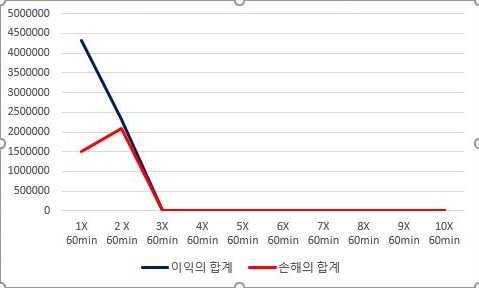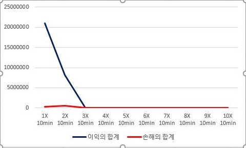 그리고 나서 다음으로 할 일은 캔들챠트 데이터베이스의 분봉간격이 30분봉인 것을 가지고서 계산을 했을 때, 어떤 결과가 나오는지에 대해서 한번 이야기를 하고자 합니다. 일단 여기서도 특별한 큰 차이없이 배수가 커질수록 손해가 줄어드는 것 보다 이익이 더 많이 줄어들고 있습니다.