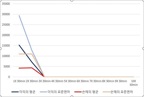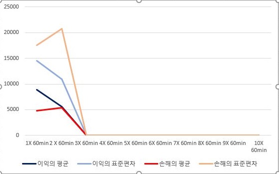 마지막으로 10 period에서 얻은 결과를 가지고서 한번 이익과 손해의 합계에 대해서 알아 보고자 합니다. 여기서 알 수 있는 것으로는 우선 표준편차에 가해지는 배수가 커지면 커질수록 평균적인 이익이나 그 이익의 총합이 줄어든 다는 것을 확실하게 알 수 있었습니다.