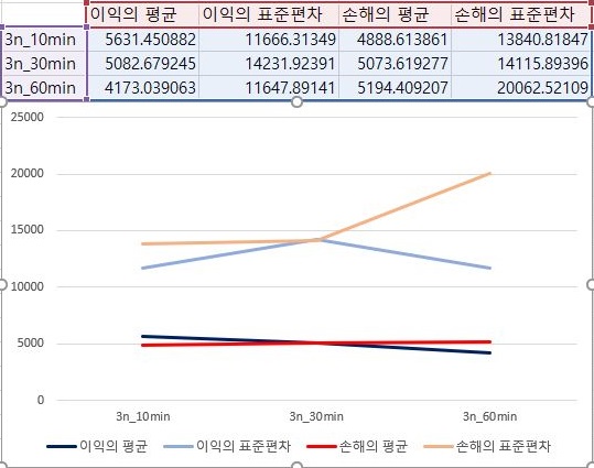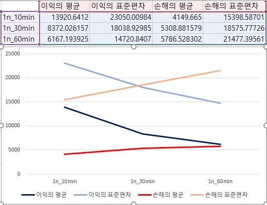 그리고 나서 다음으로 할 수 있는 것처럼 3번 조건에서 이익과 손해의 평균을 살펴보면, 거의 동률도 진행이 되다가 마지막 60분봉 캔들챠트 데이터 베이스로 얻은 결과에서는 손해를 평균적으로 이익보다 더 크게 보고 있습니다.