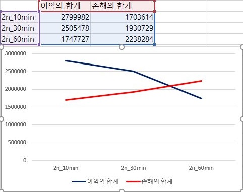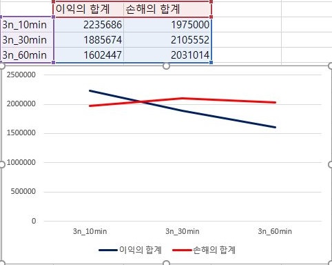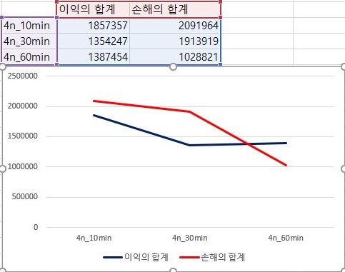 이제 다시 1번 조건으로 돌아와서, 이번에는 한번 이익과 손해의 총합을 비교해 보았습니다. 일단 캔들챠트의 분봉간격이 커지면 커질수록, 점점 이익의 합계는 떨어지고, 손해의 합계는 증가하는 경향을 보이고 있습니다.