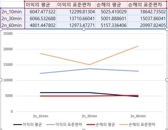 그리고 2번 조건에 대해서 한번 알아보니까, 상황이 더 나빠져서, 이익과 손해의 평균간의 간격이 더 좁아진 - 거의 일정하게 이익과 손해를 보는 것을 확인할 수 있었습니다.