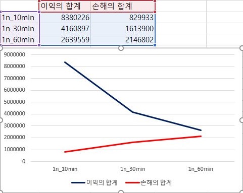 이제 다시 1번 조건으로 돌아와서, 이번에는 한번 이익과 손해의 총합을 비교해 보았습니다. 일단 캔들챠트의 분봉간격이 커지면 커질수록, 점점 이익의 합계는 떨어지고, 손해의 합계는 증가하는 경향을 보이고 있습니다.