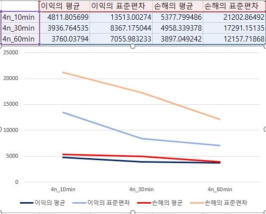 그리고 나서 다음으로 할 수 있는 것처럼 3번 조건에서 이익과 손해의 평균을 살펴보면, 거의 동률도 진행이 되다가 마지막 60분봉 캔들챠트 데이터 베이스로 얻은 결과에서는 손해를 평균적으로 이익보다 더 크게 보고 있습니다.