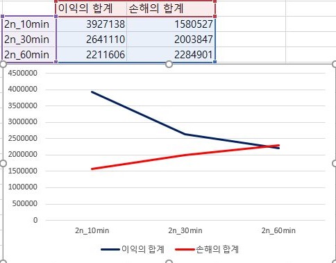 다음으로는 2번 조건으로 한번 결과를 비교해 보았습니다. 여기서는 1번 조건에 비해서 더 이익과 손해의 평균간 차이가 적으며, 60분봉 캔들챠트로 가면 갈수록 점점 더 이익의 평균은 완만하게 줄어드는 것을 확인할 수 있습니다.