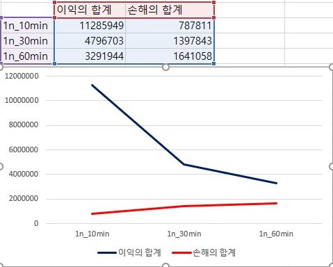 이제는 이익과 손해의 총합을 한번 비교해 보는 시간을 갖도록 했습니다. 여기서는 1번 조건을 비교해 보니, 60분봉 캔들챠트 데이터 베이스로 가면 갈수록 점점 더 이익의 총합은 줄어들고, 손해의 총합은 커지는 결과를 볼 수 있었습니다.