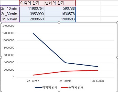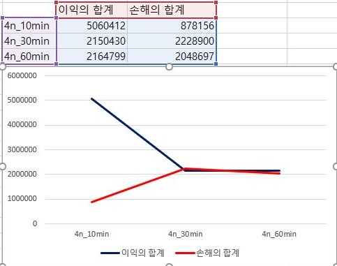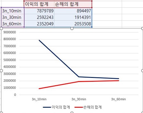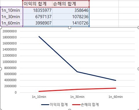 다음으로는 이익과 손해의 합계에 대해서 한번 알아보도록 합니다. 여기서 일단 캔들챠트 데이터 베이스의 분봉 간격이 커지면 커질수록 점점 이익의 합계는 급격히 떨어지고, 대신 손해의 합계는 미미하지만 증가하는 것을 확인할 수 있었습니다.