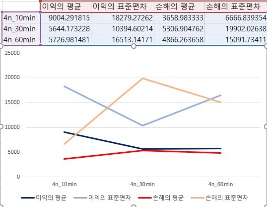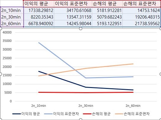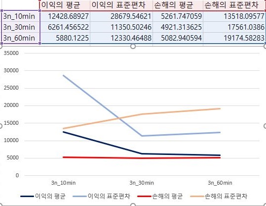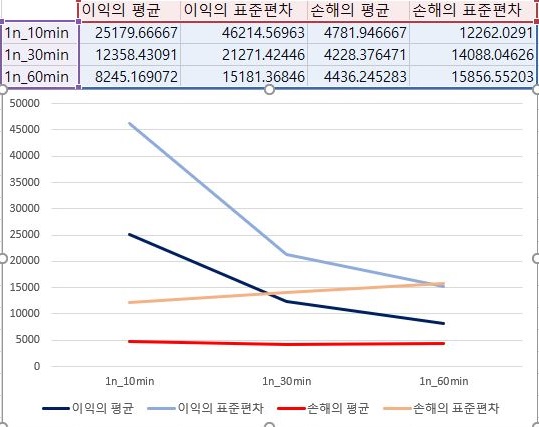 먼저 1번 조건에 대해서 하나씩 비교해 보도록 합니다. 여기서 나오는 조건을 생각해 보면, 일단 손해의 평균은 그렇게 변하지 않는데, 이익의 평균은 캔들챠트 데이터 베이스의 분봉이 내려감에 따라 꾸준히 감소하고 있습니다.