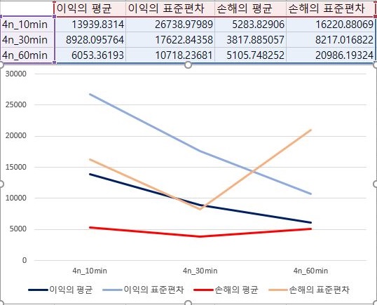 마지막으로 4번 조건에 대해서 한번 알아보고자 합니다. 여기서도 이익의 평균은 캔들챠트의 분봉간격이 커지면 커질수록 줄어는 들었지만, 손해는 그렇게 변하지 않았습니다. 이렇게 하는 것으로 일단 4개 조건에 대해서 이익과 손해의 평균과 표준편차에 대해서 한번 알아보았습니다.