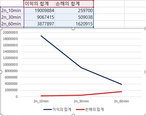 그리고 나서 이익과 손해의 합계에 대해서 한번 비교하는 그래프를 그려 보았더니, 우선 손해는 캔들챠트 데이터 베이스의 분봉이 커지면 커질수록 완만하게 증가를 했지만, 이익은 정말 급격하게 감소를 하는 것을 확인할 수 있었습니다.