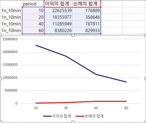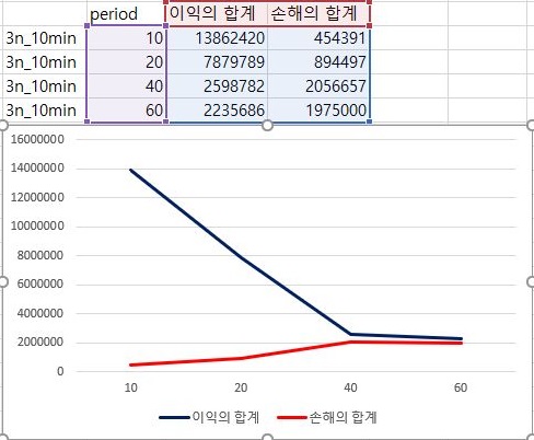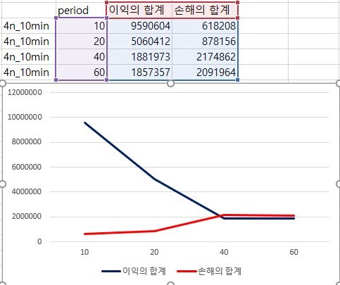 여기서는 이제 마지막 조건인 4번 조건에서 알아보면, 전체적인 양상은 3번 조건과 같으나, 40 period에서 부터는 이익의 합계보다는 손해의 합계가 더 크다는 것을 확인할 수 있었습니다. 이래서 일단 확인을 해보니, RSI지수를 기반으로 하는 매도/매수 룰에서는 10 period를 적용하고 10분봉 캔들챠트 데이터 베이스를 사용하는 것이 가장 좋은 결과를 보장하는 것으로 보입니다.