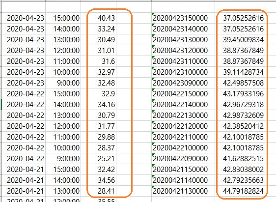 이렇게 해서 날짜와 시간, 그리고 MFI지수가 계산된 값이 나오는 것을 확인할 수 있기는 있었습니다. 이렇게 해서 나오는 것을 이제 기존의 HTS의 결과와 대조해 보도록 합니다.