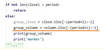 그래서 가장 먼저 중요한 것은 무엇이냐 하면, period에 해당하는 만큼 일단 들어온 챠트 데이터에서 가지고 오는 것이라고 할 수 있습니다. 그래서 먼저 하려고 하는 것은, 일단 period가 요구하는 것 이상으로 챠트의 길이가 되면, 그 때부터 작업을 시작하라고 하는 것 입니다.