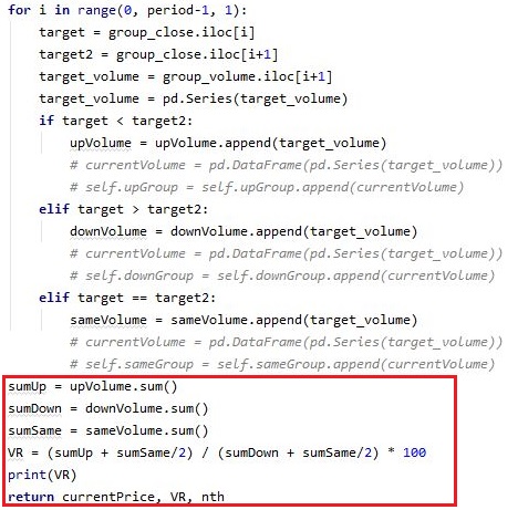 그리고 나서 제대로 VR지수가 나오는지 아닌지 일단 확인을 해 보도록 합니다. 일단 여기서는 우선 계산이 되는 것 까지는 확인을 할 수 있었습니다. 그런데 여기서 더 나아가지 않고, 대충 미봉을 한 다음에, 계속해서 MFI지수를 계산하기 위해서 움직여 봅니다.