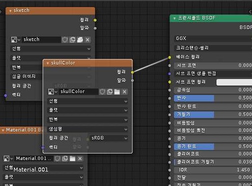 그리고 나서 다음으로 노드를 설정하는 셰이드 윈도우에서 위 스크린샷에서 볼 수 있는 것처럼 일단 skullColor이라는 텍스쳐 페인트 슬롯을 칼라로 지정해 주도록 합니다.