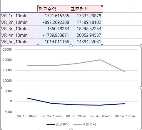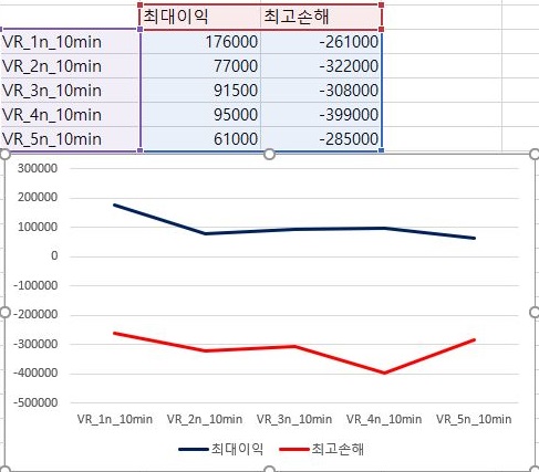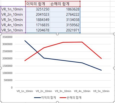 그리고 나서 이익과 손해의 합계를 한번 살펴 보고자 합니다. 여기서 나오는 것을 살펴보면, 일단 가장 널널한 조건에서 이익의 합계가 가장 크고, 이후에는 손해의 합계가 이익보다 더 큰 것을 확인할 수 있었습니다. 이래서야 10분봉 캔들챠트를 사용한 조건에서는 일단, VR지수를 사용하면 1번 조건만이 가치가 있어 보입니다.