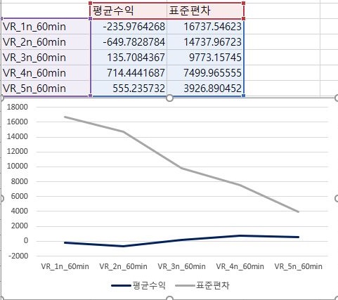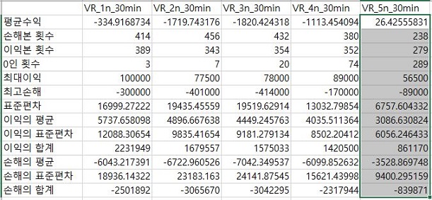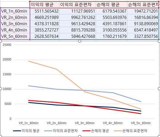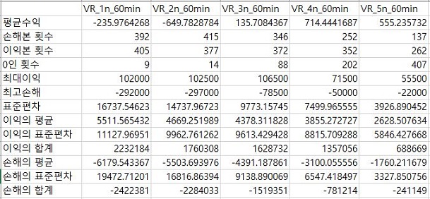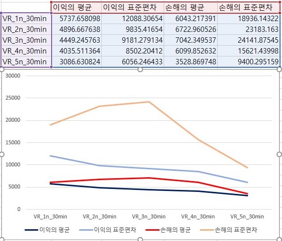 다음으로는 각각의 평균과 표준편차를 알아보면, 일단 평균적으로 이익보다 손해를 더 크게 보고 있으며, 이 상황은 4번 조건에 가서야 역전이 되지만, 이미 이익의 평균이 줄어든 다음입니다.