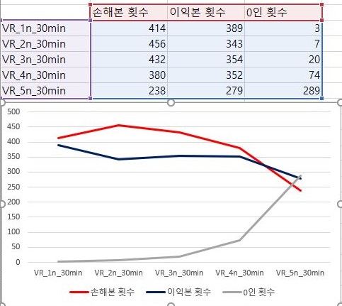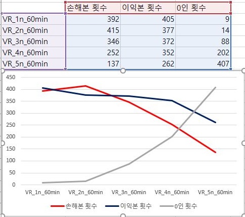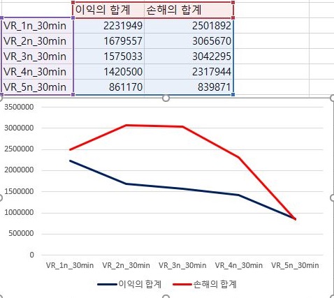 마지막으로 이익과 손해의 각각의 합계를 조사해 보면, 일단 손해를 초반에 많이 보고 있기는 있지만, 그래도 나중에 가서 이 관계가 역전이 됩니다. 하지만 이 상황에서는 거의 이익도 너무 많이 줄어든 상황이기 때문에 그렇게 쓸모가 있는지는 모르겠습니다.