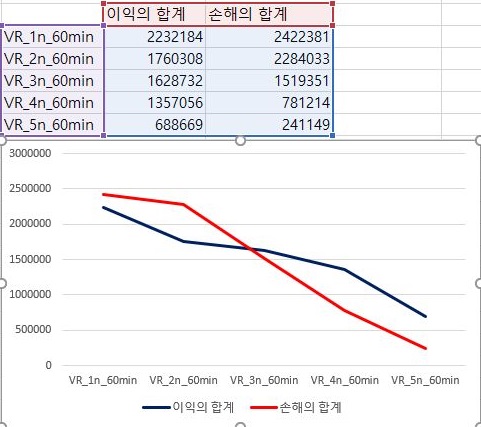 마지막으로 이익과 손해의 각각의 합계를 조사해 보면, 일단 손해를 초반에 많이 보고 있기는 있지만, 그래도 나중에 가서 이 관계가 역전이 됩니다. 하지만 이 상황에서는 거의 이익도 너무 많이 줄어든 상황이기 때문에 그렇게 쓸모가 있는지는 모르겠습니다.