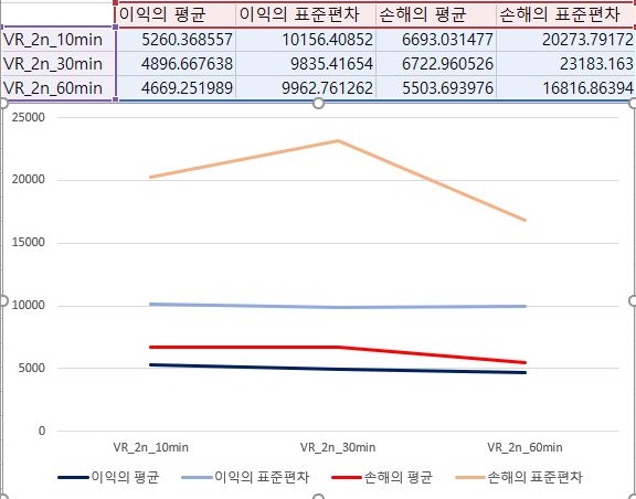 그리고 나서 다음으로 해야 하는 일로 2번 조건에 대해서 한번 알아보았는데, 상황이 더 나빠져서 계속해서 손해의 평균이 더 이익보다 크다는 것을 알 수 있습니다.