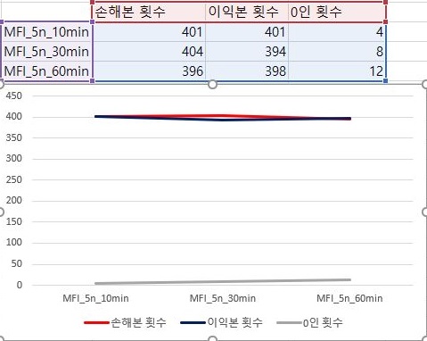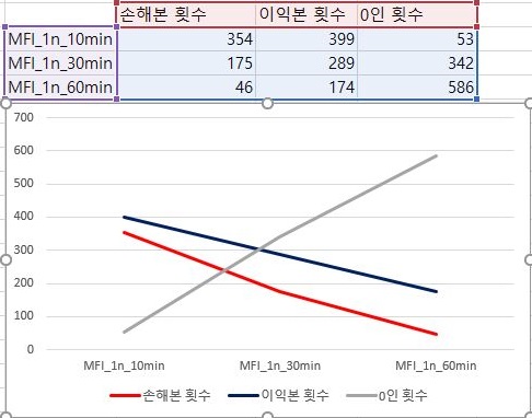 그리고 나서 다음으로는 가장 빡빡한 조건에서 어떻게 이익과 손해를 보는 종목의 갯수가 달라졌는지 일단 알아보았는데, 먼저 알 수 있는 사실은, 캔들챠트의 분봉간격이 커지면 커질수록 점점 이익보는 종목의 갯수와 손해보는 종목의 갯수가 줄어들고, 그 대신에 거래가 없는 종목이 늘어납니다.