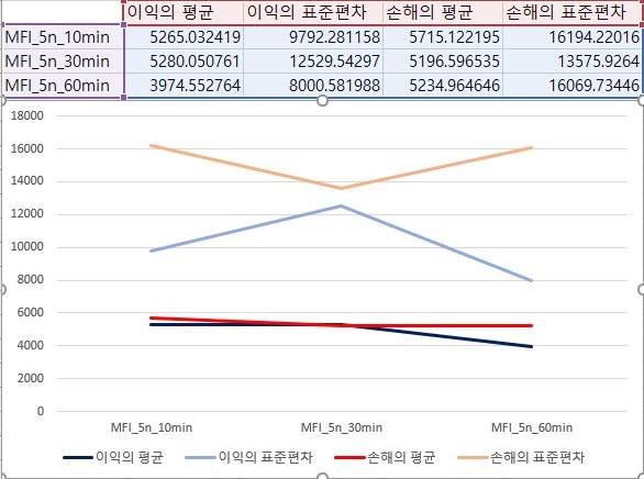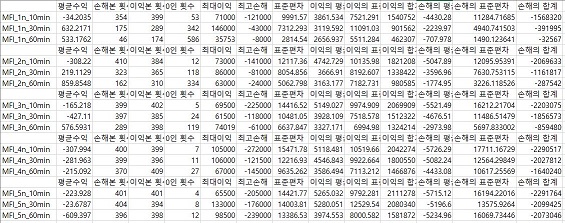 그리고 가장 널널한 조건에서 한번 작업을 해 보고자 합니다. 일단 여기서는 언제나 이익의 평균보다 손해의 평균이 조금은 더 크기는 합니다. 그리고 30분봉까지는 큰 변동이 없다가 60분봉으로 가면서 눈에는 보일 정도로 이익의 평균이 내려가는 것을 볼 수 있습니다.