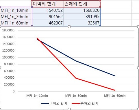 그리고 나서 다음으로 작업을 하기 위해서 가장 널널한 조건에서 한번 이익과 손해의 합계를 알아 보도록 합니다. 여기서 나오는 합계를 따지고 들면, 일단 언제나 손해의 합계가 이익보다 더 크기는 하지만, 그것 보다도 이익의 합계는 분봉의 간격이 커지면 커질수록 30분봉까지는 이익의 합계가 그리 감소하지 않았으나, 이후에는 급격히 감소합니다.