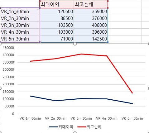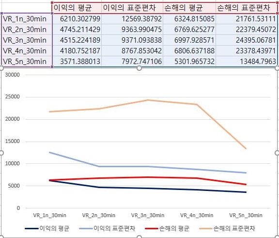 이렇게 해서 나오는 마지막 그래프로, 일단 위 스크린샷에서 보이는 것처럼 이익의 합계는 우선 조건이 빡빡해 지면 질수록 점점 더 작아지는 것을 확인할 수 있는데, 손해는 3번 조건이 될 때까지는 증가하는 것을 확인할 수 있었습니다. 그 이후에는 거래가 없는 종목이 많아져서 전체적인 손해의 총합도 줄어드는 것을 확인할 수 있었습니다.