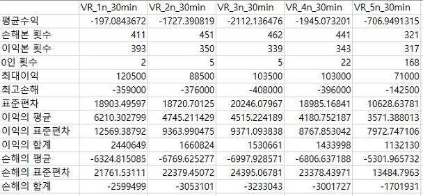 다음으로는 해야 할일인 바로 이익만 난 종목의 이익값과 손해가 난 종목의 손해값만을 모아서 한번 비교하는 작업을 해 주어야 합니다. 이 작업에 있어서는 언제나 이익의 평균이 손해의 평균보다 작으며, 그 차이는 조건이 빡빡해지며 질수록 일단 이익의 평균이 줄어드는 것으로 실현이 되는 것을 확인할 수 있었습니다.
