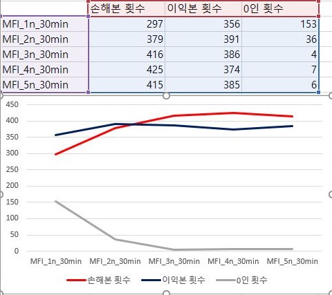 그리고 나서 다음으로 봐야 하는 것으로는 일단 손해와 이익, 그리고 아무런 거래가 없는 종목의 갯수를 살펴 보았는데, 마지막 가장 빡빢한 조건인 1번 조건으로 가서야 이익보는 종목의 갯수가 이익보는 종목의 갯수보다 더 많아는 지는데, 그 때쯤 가면, 아무런 거래도 없는 종목도 상당히 늘어났습니다.