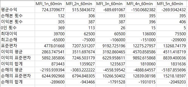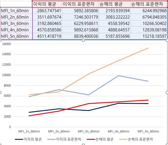 그리고 나서 다음으로 생각해 봐야 하는 것으로는, 일단 이익과 손해의 최대치를 한번 비교해 보았는데, 우선 대다수의 경우에는 손해의 최대치가 압도적으로 크며, 조건이 빡빡해 지면 질수록 점점 감소하다가 마지막 가장 빡빡한 1번 조건으로 가서야 역전이 되는 경향이 있습니다.