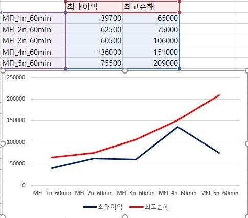 다음으로 생각해 보아야 하는 것은 최고로 본 이익과 손해에 대해서 살펴 보자면, 일단 손해의 경우에는 조건이 빡빡해 지면 질수록 꾸준히 감소하는 경향을 보이고 있습니다만, 이익의 최대치의 경우에는 두번째로 널널한 조건 이후에는 꾸준한 감소세를 보이고 있습니다.