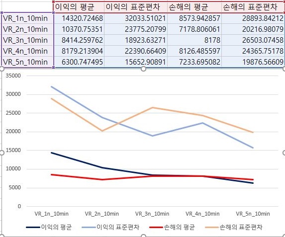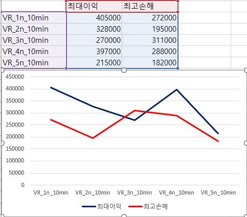 그리고 나서 다음으로 해주어야 하는 과제로는 이익과 손해의 최대치를 비교해 보았는데, 여기서는 조건에 따라서 들쭉날쭉해서 그렇게 특이한 경향이 있는지 확인하기는 어려웠습니다.