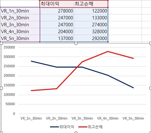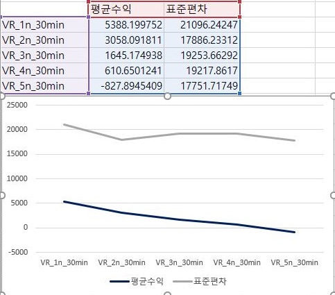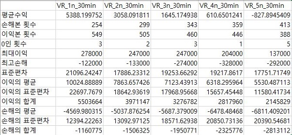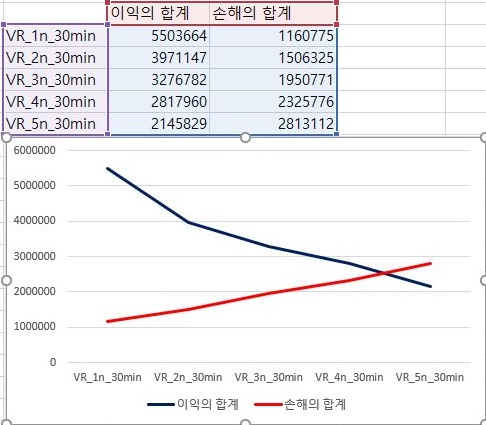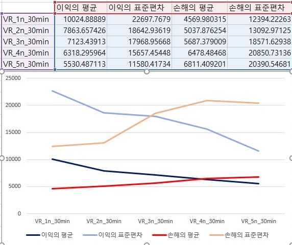 그리고 나서 다음으로 확인을 해보면, 여기서 확인을 할 수 있는 것으로는 손해를 본 종목의 갯수는 VR지수를 적용하는 조건이 빡빡해지면 질수록 점점 더 증가하며, 이익을 본 종목의 갯수는 감소한다는 사실을 알 수 있습니다.