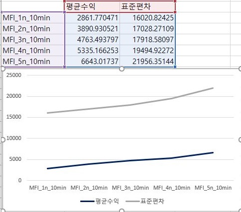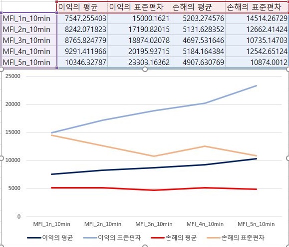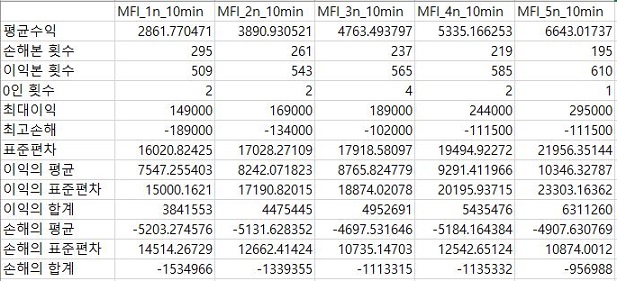 그렇게 하고 나서 이익과 손해만을 각각 따로모아서 한번 평균과 표준편차를 내놓도록 했습니다. 여기서 나오는 것을 보면, 우선 이익의 평균은 언제나 손해의 평균보다 높았지만, MFI지수 적용의 조건이 빡빡해 지면 질수록 점점 줄어들었습니다. 이와는 반대로 손해의 평균은 그렇게 변화가 없는 것을 보여주었습니다.